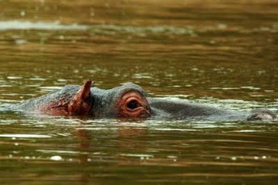 Suddenly the wind changed and the hippo jumped up and charged into the water. He was, all the while, facing in our direction and could even possibly have seen us, in front of his nose, in the reeds.
